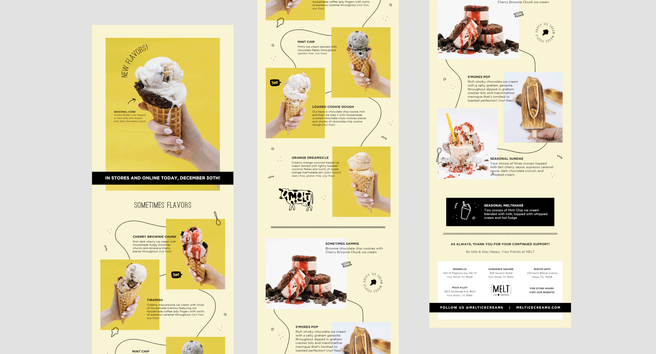 Facilitated daily design needs for this local business - conceptualizing and designing collateral pieces for the shops (Newsletters, QR code menus, a-frame posters, flyers, packaging stickers, gift cards, etc.) Aided the social media team by art-directing photoshoots as well as creating social media graphics.